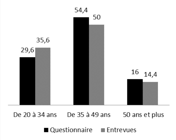 Questionnaire: Plus de la moitié des répondantes sont âgées de 35 à 49 ans (54,4%), moins du tiers sont âgées de 20 à 34 ans (29,6%) et 16% sont âgées de plus de 50 ans. Entrevues: Un peu plus du tiers des participantes sont âgées de 20 à 34 ans (35,6%), la moitié ont de 35 à 49 ans et 14,4% ont 50 ans et plus.