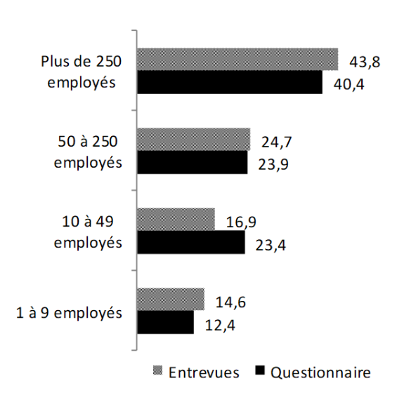 Questionnaire: Un peu plus de 4 répondantes sur 10 (40,4%) travaillent dans une entreprise de plus de 250 employés, 23,9% dans une entreprise de 50 à 250 employés, 23,4% dans un milieu de 10 à 49 employés et 12,4% dans un milieu de 9 employés et moins. Entrevues: une majorité travaille dans une entreprise de plus de 250 employé-es (43,8%), près du quart travaille dans une entreprise qui compte de 50 à 250 employé-es (24,7%). Le dernier tiers travaille pour moitié dans des entreprises de plus petite dimension, soit 16,9% dans une entreprise de 10 à 49 employé-es et 14,6% dans une entreprise de moins de 9 employé-es.