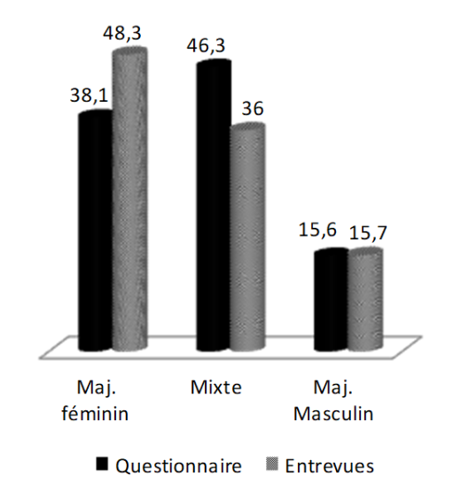 Questionnaire: Près de la moitié de l’échantillon (46,3%) occupe un emploi dans un milieu mixte, près de 4 répondantes sur 10 (38,1%) travaillent dans un milieu composé d’une majorité de femmes et 15,6% travaillent dans un milieu composé d’une majorité d’hommes. Entrevues: une majorité travaille dans un milieu très majoritairement féminin (48,3%), plus du tiers œuvre dans un milieu mixte (36%), une minorité travaille dans un milieu très majoritairement masculin (15,7%)