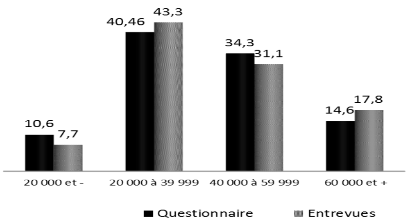 Questionnaire: une majorité de répondantes rapportent avoir un revenu entre 20 000$ et 39 999$ (40,46%) et 34,3% gagnent entre 40 000$ et 59 999$. Elles sont 10,6% à gagner moins de 20 000 $ et 14,6 % gagnent au-delà de 60 000 $. Entrevues: une majorité de participantes rapportent avoir un revenu entre 20 000$ et 39 999$ (43,3%) et 31,1% gagnent entre 40 000$ et 59 999$. Elles sont 7,7% à gagner moins de 20 000$ et 17,8% gagnent au-delà de 60 000$.