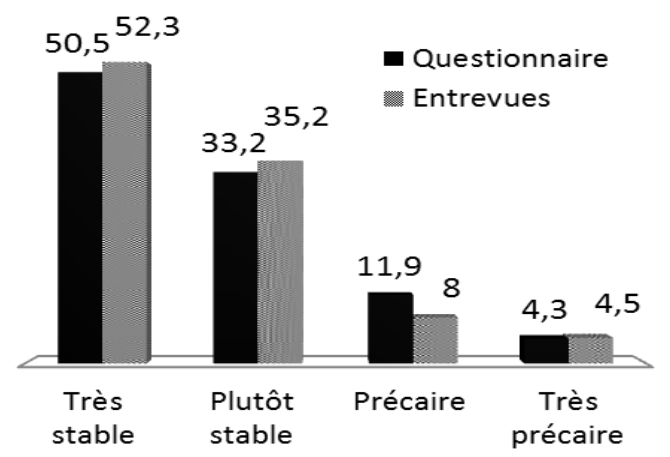 Questionnaire: Un peu plus de la moitié considère être dans une situation d’emploi très stable (50,5%) et près du tiers dans une situation d’emploi plutôt stable (33,2%). Les autres considèrent leur emploi plutôt précaire (11,9%) et très précaire (4,3%). Un peu plus de la moitié des répondantes sont syndiquées (55,3%). Entrevues: Un peu plus de la moitié considère être dans une situation d’emploi très stable (52,3%) et près du tiers dans une situation d’emploi plutôt stable (35,2%). Les autres considèrent leur emploi plutôt précaire (8%) et très précaire (4,5%). Plus de la moitié des participantes sont syndiquées (54,4%).
