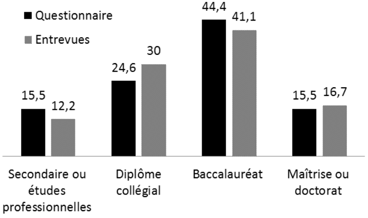 Questionnaire: une majorité de répondantes détient un diplôme universitaire: 44,4% ont complété un baccalauréat et 15,5% ont complété une maîtrise ou un doctorat. Près du quart d’entre elles détiennent un diplôme collégial ou l’équivalent et seules 15,5% n’ont complété que leur secondaire ou des études professionnelles. Entrevues: une majorité de participantes ont complété une scolarité universitaire (57,8%), 41,1% ont un baccalauréat et 16,7% ont une maîtrise ou un doctorat. Elles sont 30 % à détenir un diplôme d’études collégiales ou l’équivalent et seulement 12,2% n’ont complété que leur secondaire ou des études professionnelles.