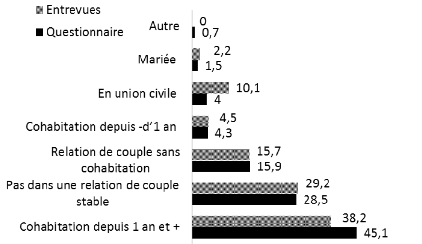 Questionnaire: une majorité de répondantes sont en cohabitation depuis un an et plus avec leur conjointe (45,1%), plus du quart ne sont pas dans une relation de couple stable au moment de l’enquête (28,5%). Elles sont 15,9% à être dans une relation de couple sans cohabitation et 4,3% sont en cohabitation avec leur conjointe depuis moins d’un an. Enfin, 4% des répondantes ont contracté une union civile et 1,5% sont mariées avec leur conjointe. Entrevues: une majorité de participantes sont en cohabitation depuis un an et plus avec leur conjointe (38,2%), plus du quart ne sont pas dans une relation de couple stable (29,2%). Elles sont 15,7% à être dans une relation de couple sans cohabitation et 4,5% sont en cohabitation avec leur conjointe depuis moins d’un an. Enfin, 10,1% des participantes ont contracté une union civile et 2,2% sont mariées avec leur conjointe.